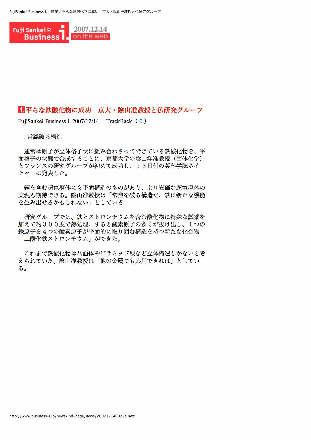 - フジサンケイビジネスアイ (2007年12月14日、WEB)