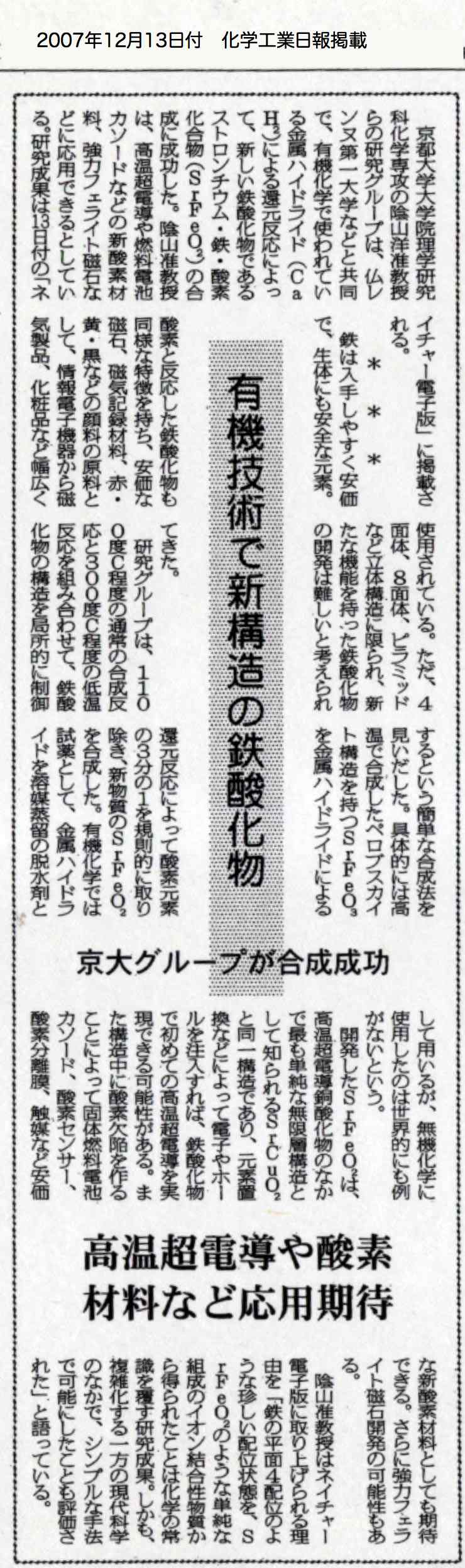 - 化学工業日報 (2007年12月13日、1面)
