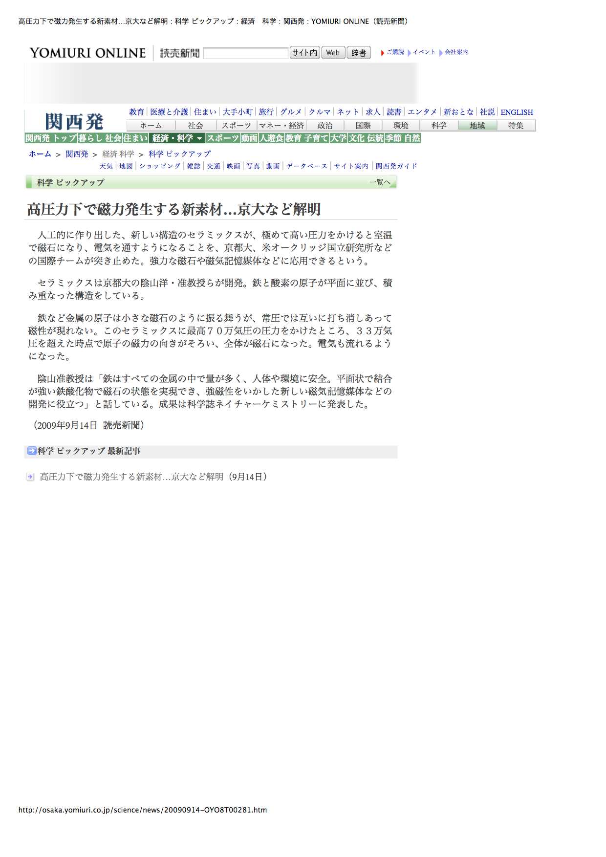 - 読売新聞 (2009年9月14日、WEB)