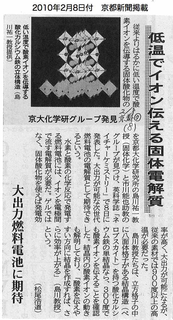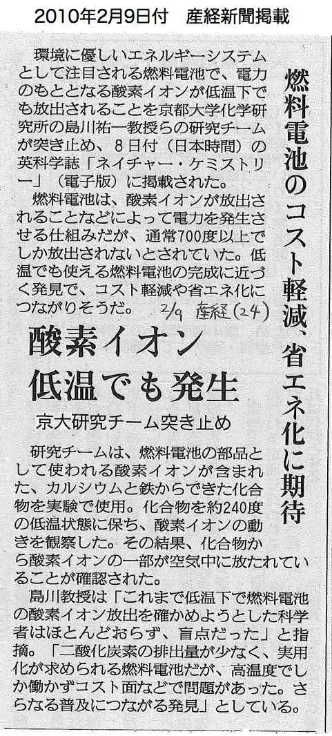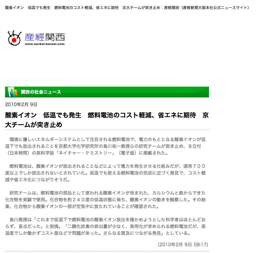 酸素イオン低温でも発生 燃料電池のコスト軽減,省エネ化に期待 京大研究チーム突き止め