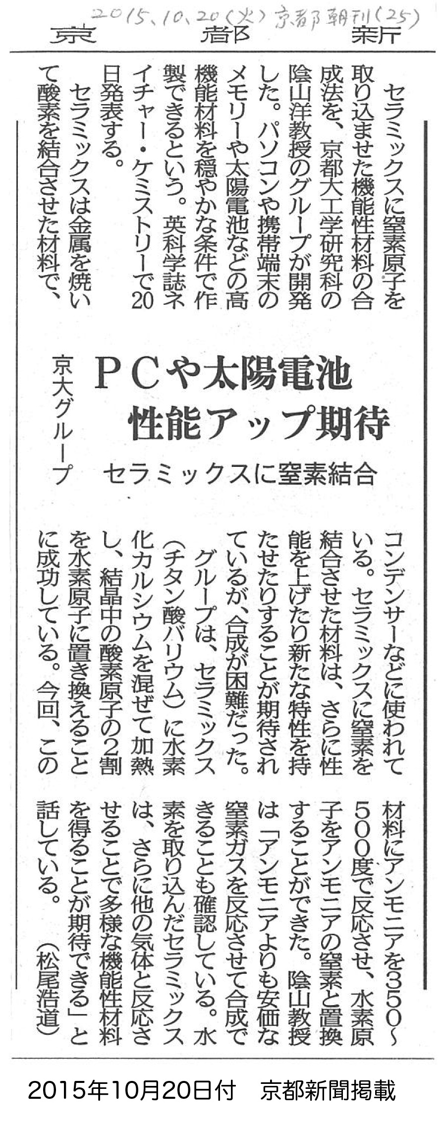 PCや太陽電池性能アップ期待 セラミックスに窒素結合 京大グループ